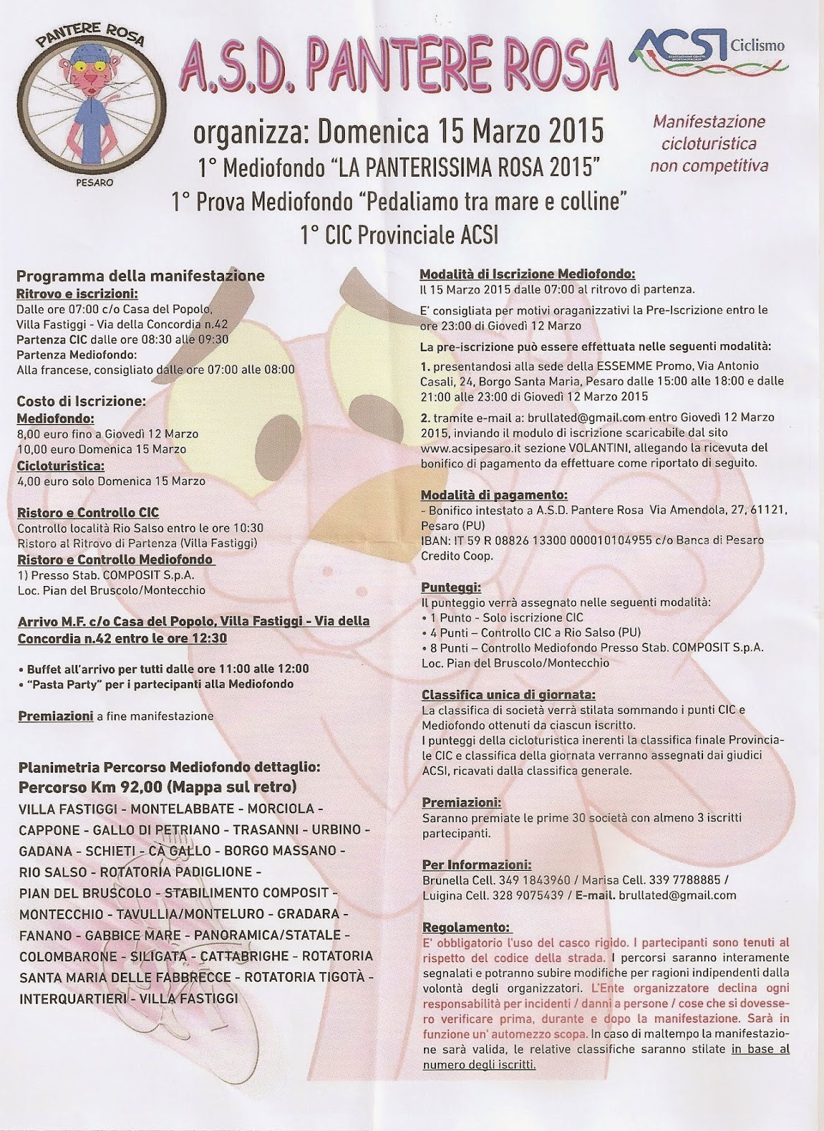 Tutto pronto o quasi per la Panterissima, la Mediofondo non competitiva che apre la stagione cicloturistica pesarese. Si tratta di una lodevole iniziativa del gruppo femminile delle Pantere Rosa il quale sta organizzando un evento ciclistico, sullo stile Romagna Sprint peraltro a noi già conosciuto, con l'intenzione che il percorso possa risultare interessante anche per quei ciclisti che gradiscono distanze più lunghe. Ovviamente il GS Cicli Olivieri sarà presente in buon numero grazie alle pre-iscrizioni ( € 8.00) già raccolte fino ad oggi.